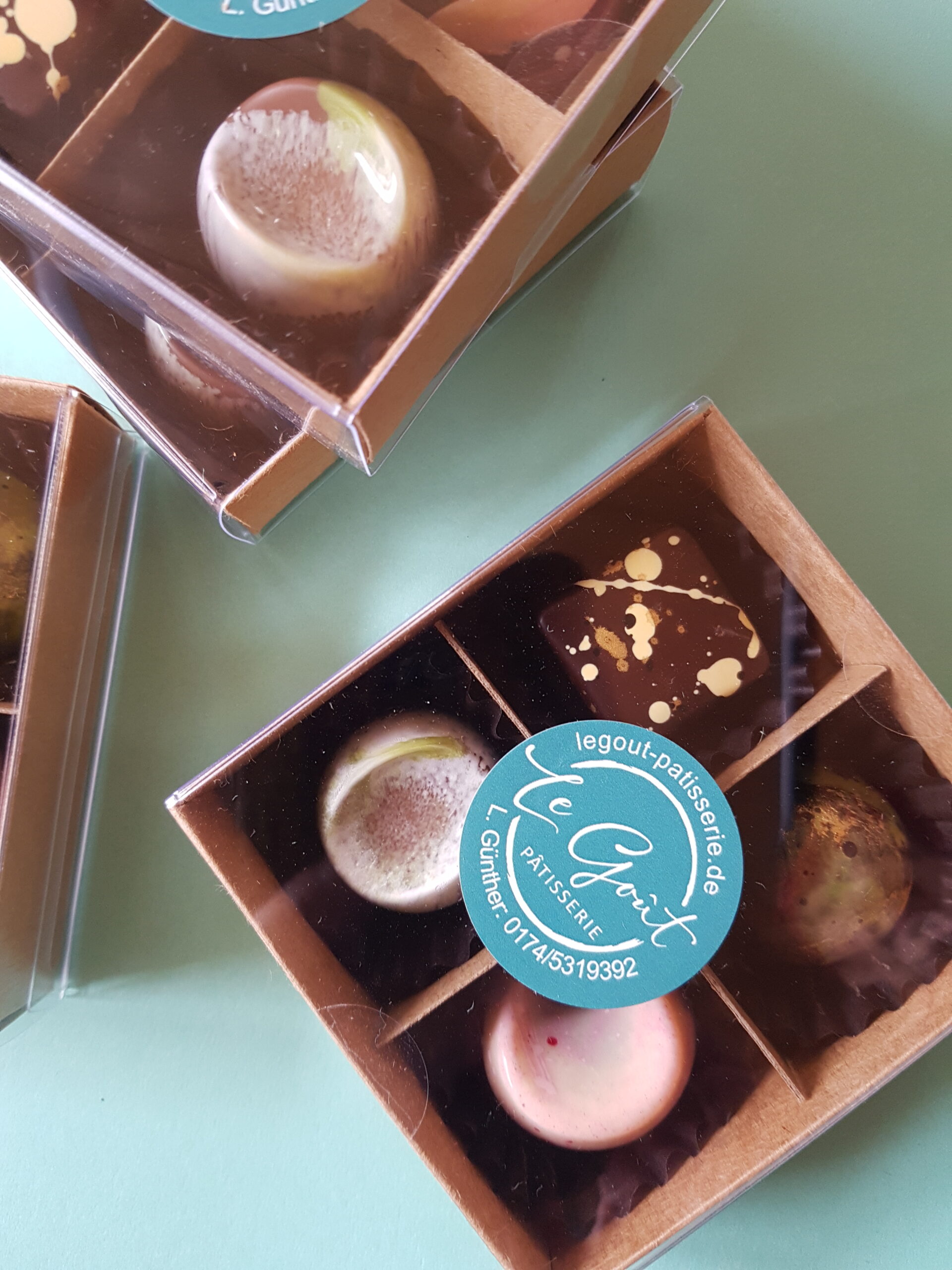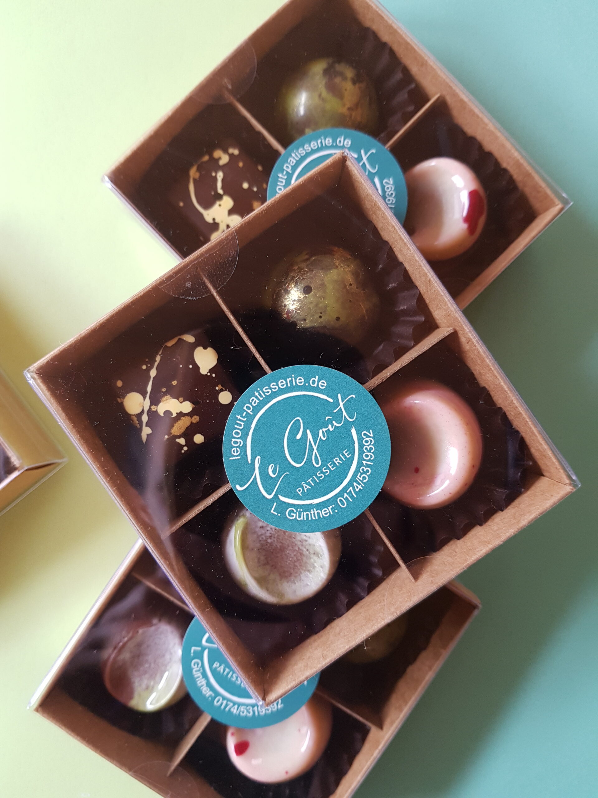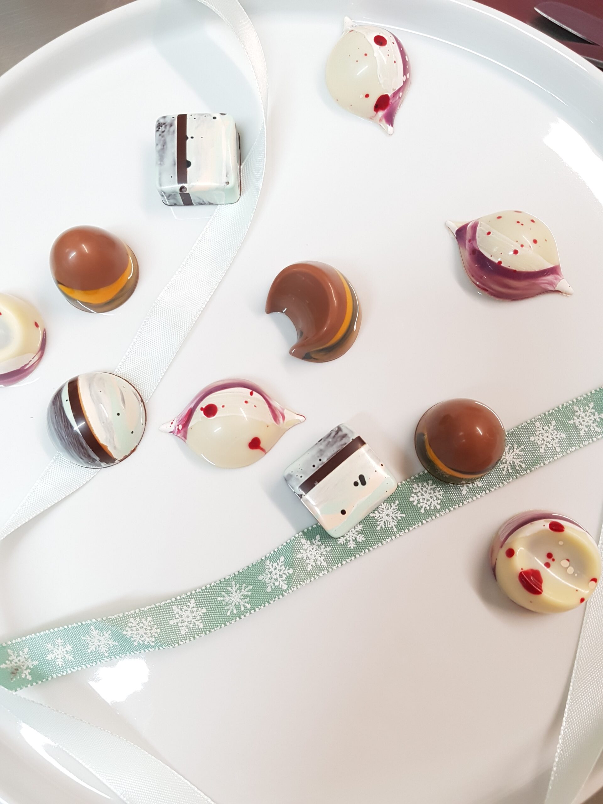 Meine Pralinen sind handbemalt und selbstgegossen – liebevoll gefertigt, meist passend zu saisonalen Anlässen wie Ostern oder Weihnachten. Innen warten cremige Füllungen aus hochwertigen Kuvertüren, wahlweise mit Frucht und/oder einem feinen Hauch Alkohol. Eine wirklich gute Praline erkennt man am edlen Glanz – und daran, dass sie beim Brechen oder Reinbeißen fein „knackt“.